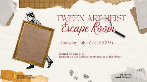 One of the museum’s most valuable paintings has vanished! Follow clues and crack codes to track it down. Solve the mystery and return the art! Register on our website, by phone, or at the library. Geared for ages 8-11.